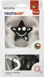 Praktisches schwarz-weißes Rassel-Set für Babys kombiniert eine Kinderwagenkette und eine separate Rassel in Form eines Sterns oder einer Blume. Kontrastreiche Farben unterstützen die visuelle Wahrnehmung, während der sanfte Klang und die sicheren Formen Motorik und Sinne des Kindes fördern. Die Rasseln sind für bequemes Greifen gestaltet und erfüllen strenge Hygienestandards. Ohne scharfe Kanten, ohne kleine, lösbare Teile und ideal für das tägliche Spielen zu Hause und unterwegs.