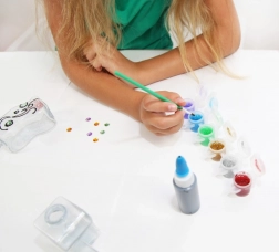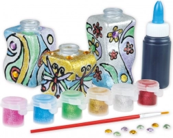 Entdecken Sie kreatives Basteln mit dem Glasmalerei-Kreativset. Das Set enthält alles Nötige zur Gestaltung origineller Dekorationen – 3 Vasen, 6 glitzernde Farben, einen Pinsel, Ziersteine und Modelliermasse. Fördert Kreativität, Feinmotorik und die kindliche Fantasie.
