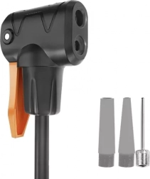 Der universelle Doppelkopf ist für Auto- und Fahrradventile ausgelegt; im Lieferumfang sind außerdem eine Ballnadel und 2 konische Aufsätze zum Aufpumpen von Matratzen oder Spielzeug enthalten. Eine stabile Standplattform und ein rutschfester Griff sorgen bei jedem Hub für Komfort und Effizienz.