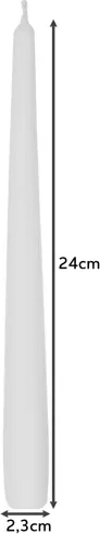 Schaffen Sie eine angenehme Atmosphäre mit weißen konischen Kerzen, die Festtafeln und Innendekoration perfekt ergänzen. Dank der Höhe von 24,5 cm und dem schlanken Durchmesser von 2,3 cm wirken sie elegant und passen in die meisten klassischen Kerzenhalter.