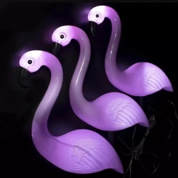 Im Paket erhalten Sie drei Lichter in Flamingo-Form, verbunden mit einem Solarpanel und ausgestattet mit LEDs für dezente Beleuchtung.<>