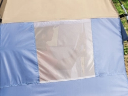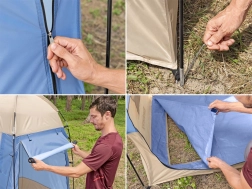 Die Umkleidekabine ist mit einem Reißverschluss ausgestattet, der einfachen Zugang und Belüftung ermöglicht. Drei seitliche Fenster sorgen für effektive Belüftung.
