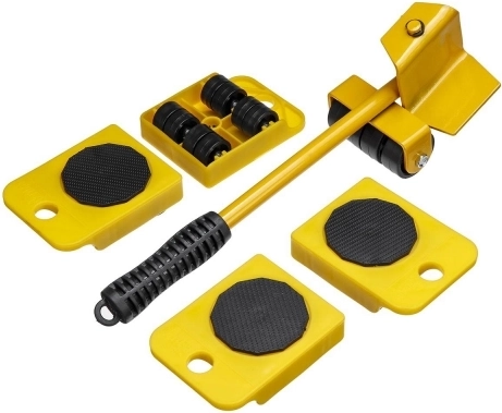 Praktisches Set für das einfache Verschieben von Möbeln und Geräten bis zu 150 kg. Enthält 4 Rollenauflagen und einen Hebel aus Stahl zum Anheben der Last. Robuste Materialien und eine drehbare Plattform in der Mitte ermöglichen ein reibungsloses Manövrieren in alle Richtungen.