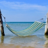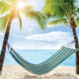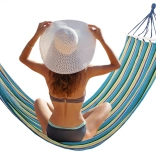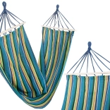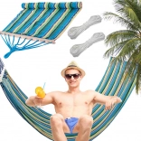 Genießen Sie perfekte Entspannung draußen oder zu Hause – diese gestreifte Hängematte mit Holzspreizstäben bietet hohe Stabilität, eine bequeme Liegefläche von 200 × 80 cm und eine einfache Montage. Das strapazierfähige Baumwoll-Polyester-Gemisch ist angenehm auf der Haut und atmungsaktiv, Tragkraft bis zu 150 kg. Inklusive Befestigungsschnüre zum schnellen Aufhängen zwischen Bäumen, an einem Gestell oder Wandhaltern.