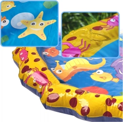Gelbe Matte mit blauem Zentrum, liebevolle Illustrationen von Meerestieren sowie aufblasbare Figuren von Seestern und Fisch fördern Fantasie und sensorische Wahrnehmung.