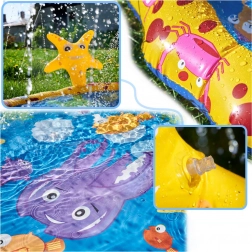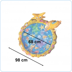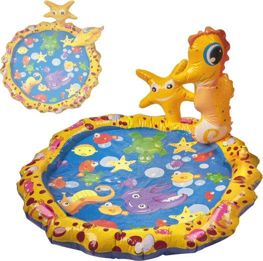Machen Sie heiße Tage zum Vergnügen! Diese aufblasbare Wasser-Spielmatte mit Sprinkler für Kinder bietet Erfrischung, sicheres Wasserspiel und aktive Bewegung im Freien. Einfach den Gartenschlauch anschließen und entlang des Randes beginnen feine Fontänen zu sprühen. Das fröhliche gelbe Design mit Meerestieren sowie aufblasbaren Figuren eines Seepferdchens und eines Seesterns begeistert jedes Kind.