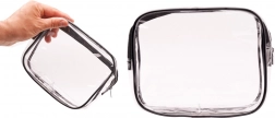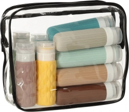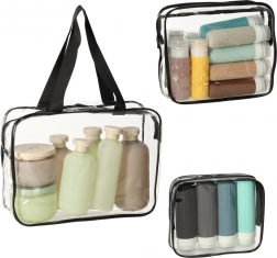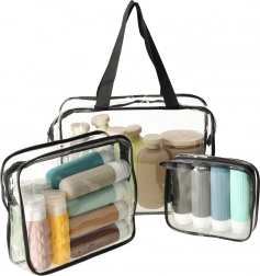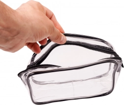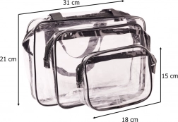 Behalten Sie auf Reisen und zu Hause Ordnung mit dem Set aus drei transparenten Kosmetik-Organizern. Wasserfestes PVC schützt den Inhalt vor Feuchtigkeit und eventuell auslaufenden Flüssigkeiten, während robuste Reißverschlüsse alles sicher verschließen. Dank der transparenten Ausführung sehen Sie den Inhalt sofort und passieren die Sicherheitskontrolle am Flughafen mühelos.