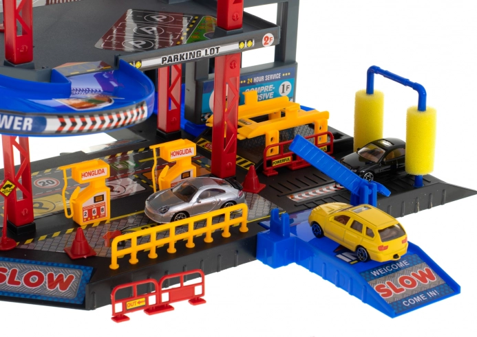 Mehrstöckiges Parkhaus mit Station und Waschanlage, ausgestattet mit vielen Ebenen für maximalen Spaß und Entwicklung der kindlichen Fantasie.