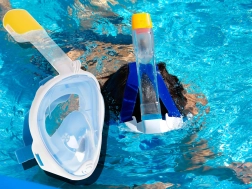 Die Vollgesichtskonstruktion ermöglicht das Atmen durch Mund und Nase und bietet ein verzerrungsfreies Panoramasichtfeld. Ideal für entspanntes Schnorcheln an der Oberfläche.