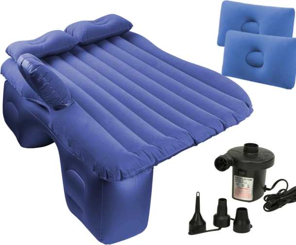 Genießen Sie bei jeder Autofahrt eine bequeme Ruhepause. Diese aufblasbare Veloursmatratze verwandelt die Rücksitze schnell in einen komfortablen Schlafplatz. Sie besteht aus einem Liegeteil und einer abnehmbaren Stütze für einen stabilen Halt auf der Rückbank. Im Lieferumfang enthalten sind außerdem eine Elektropumpe für den Zigarettenanzünder, zwei aufblasbare Kissen und eine praktische Tasche.