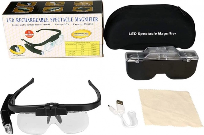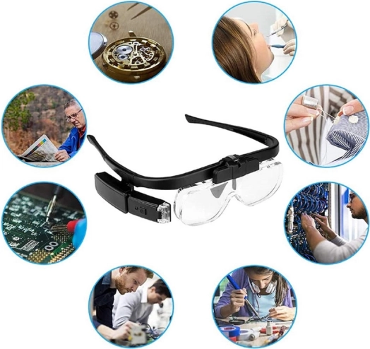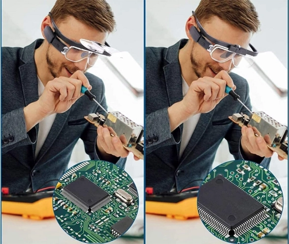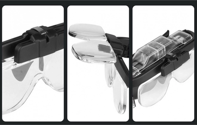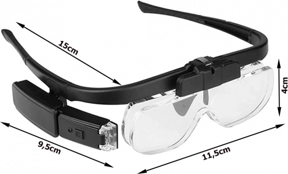 Professionelle Stirnlupe in Brillenform mit austauschbaren Linsen bietet komfortable Vergrößerung für präzises Arbeiten zu Hause und in der Werkstatt. Dank hohem Tragekomfort, integrierter LED-Beleuchtung und schnellem Linsenwechsel erhalten Sie ein klares und gut lesbares Bild bei Elektronikreparaturen, Uhrmacherei, Numismatik und der Kontrolle von Schmuck.