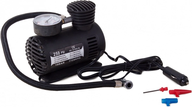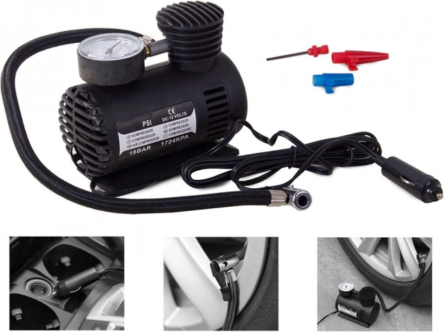 Das Paket enthält einen Kompressor mit Schlauch, Zündstecker, Manometer und ein Set von Aufsätzen für verschiedene Bedürfnisse.