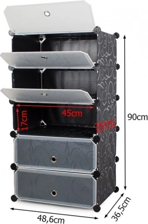 Der Schuhschrank verfügt über 5 Regalböden, die flexibel gestapelt oder nebeneinander angeordnet werden können, je nach Platzbedarf. Die Konstruktion ist leicht und stabil, was die Handhabung und Montage erleichtert. Dank der transparenten Fenster finden Sie schnell und einfach, was Sie suchen. Das Material des Schranks ist wasserfest und kann problemlos gereinigt werden.