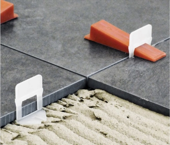 Clips und Keile halten die Fliesen in einer Ebene, sodass keine Höhenunterschiede (Lippage) entstehen und das Ergebnis perfekt glatt wird.
