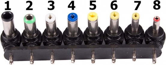 - 1) 3,5 × 1,35 mm; 2) 4,0 × 1,7 mm (z. B. Sharp); 3) 4,8 × 1,7 mm (z. B. Compaq, Fujitsu Siemens, einige HP); 4) 5,5 × 1,7 mm (z. B. Acer); 5) 5,5 × 2,1 mm; 6) 5,5 × 2,5 mm (z. B. Fujitsu Siemens, IBM, Asus, Acer, Maxdata, Medion, Toshiba A300D, Gericom, Action); 7) 6,3 × 3,0 mm (z. B. DELL, dicker Stecker Toshiba A100, NEC); 8) 6,5 × 4,4 mm (z. B. Sony Vaio, Panasonic)