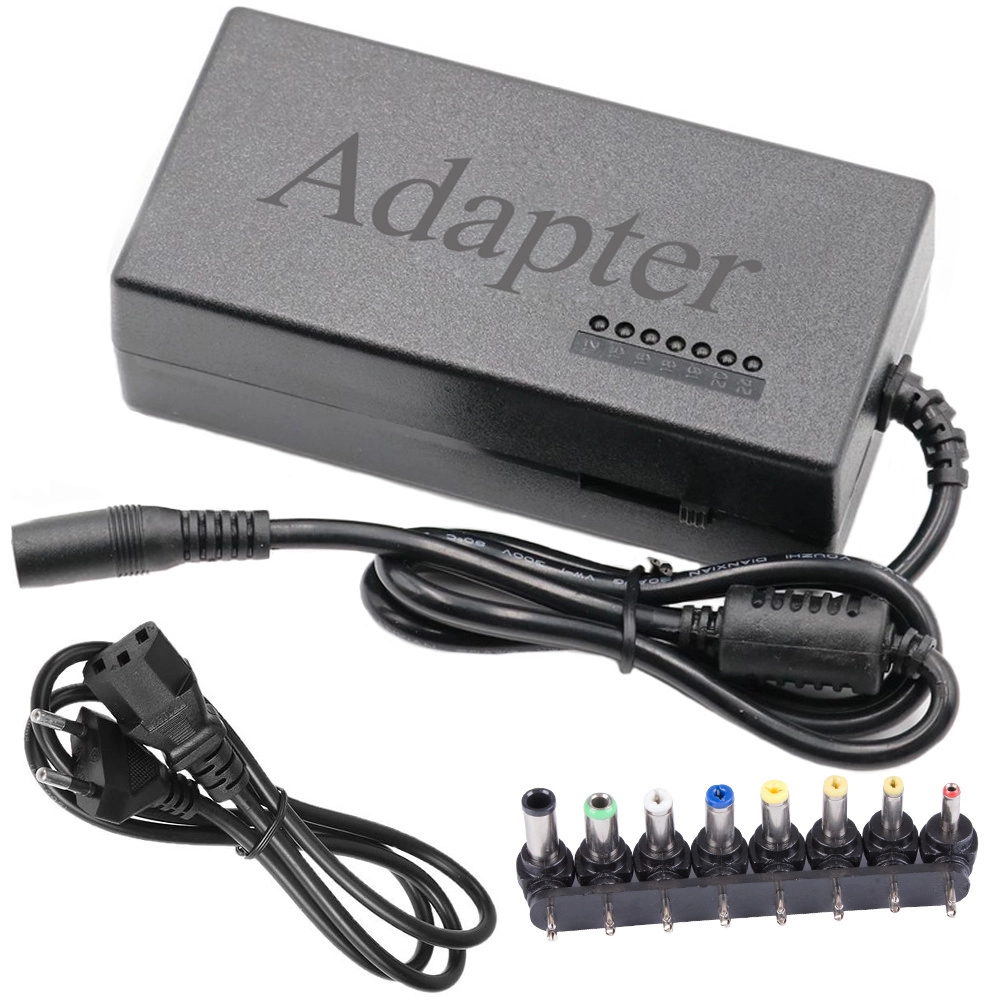 Universelles 96-W-Notebook-Ladegerät, einstellbare Spannung 12–24 V, 8 Stecker, LED-Anzeige und Schutz vor Überspannung, Überhitzung und Kurzschluss.