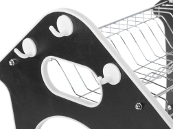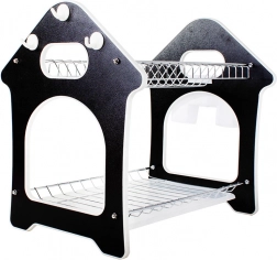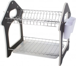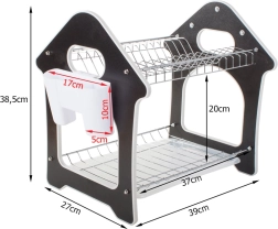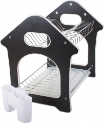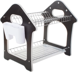 Praktischer zweistöckiger Geschirrabtropfer mit Wasserauffang-Tablett, Besteckhalter und drei Haken für Küchenutensilien. Bietet eine große Kapazität, eine robuste Konstruktion aus Metall und Kunststoff und eine stabile Basis, die die Arbeitsplatte vor Feuchtigkeit schützt. Das stilvolle Haus-förmige Design passt perfekt in jede Küche.