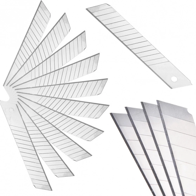 Set aus 18‑mm‑Abbrechklingen im praktischen 10er‑Pack für Universalmesser. Sorgt für einen scharfen, sauberen Schnitt, eine schnelle Wiederherstellung der Schneide und zuverlässige Leistung beim Arbeiten mit Tapeten, Karton, Teppichen, Kabeln und Klebebändern.