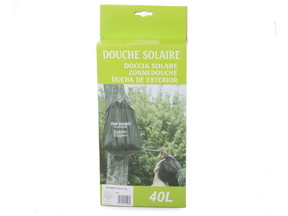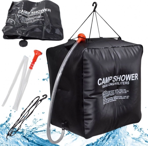 Praktische solare Campingdusche mit einem Volumen von 40 l sorgt für warmes Wasser überall in der Natur. Einfach füllen und in die Sonne legen – die dunkle Oberfläche erwärmt das Wasser schnell. Ideal fürs Camping, Wohnmobil, den Strand und den Garten. Dank flexiblem Schlauch, Duschkopf und Durchflussregulierung ist die Nutzung komfortabel und sparsam.