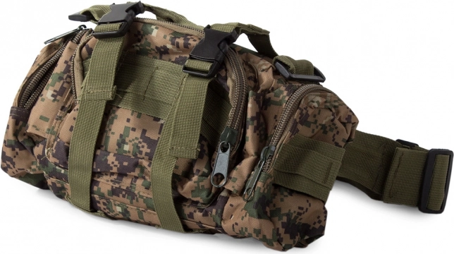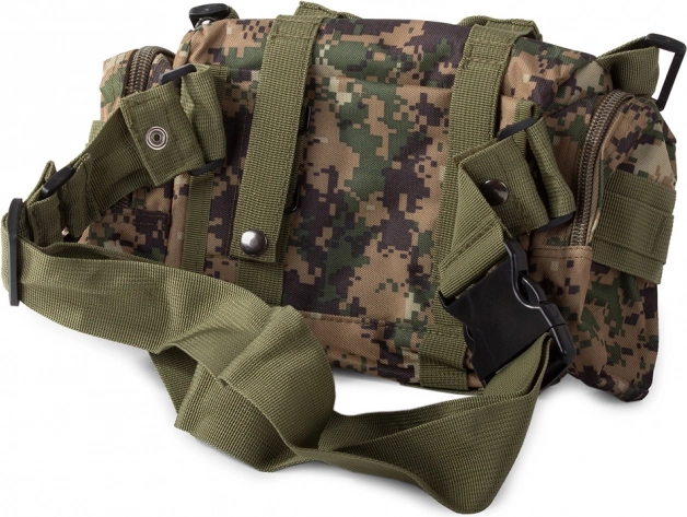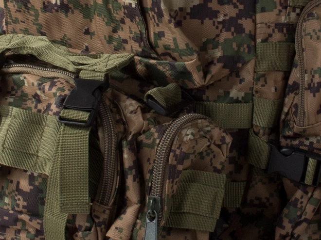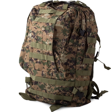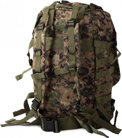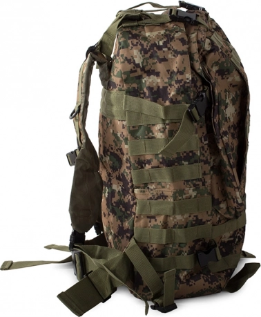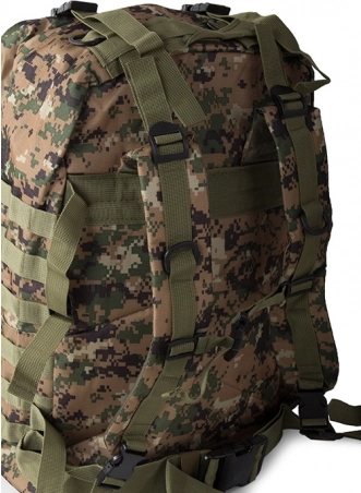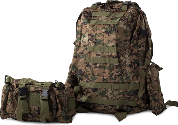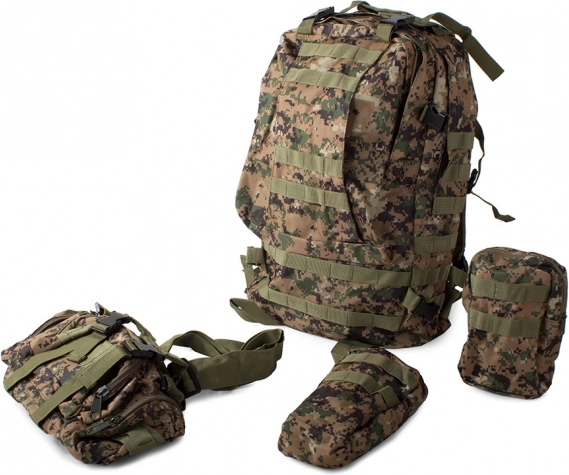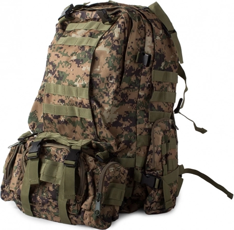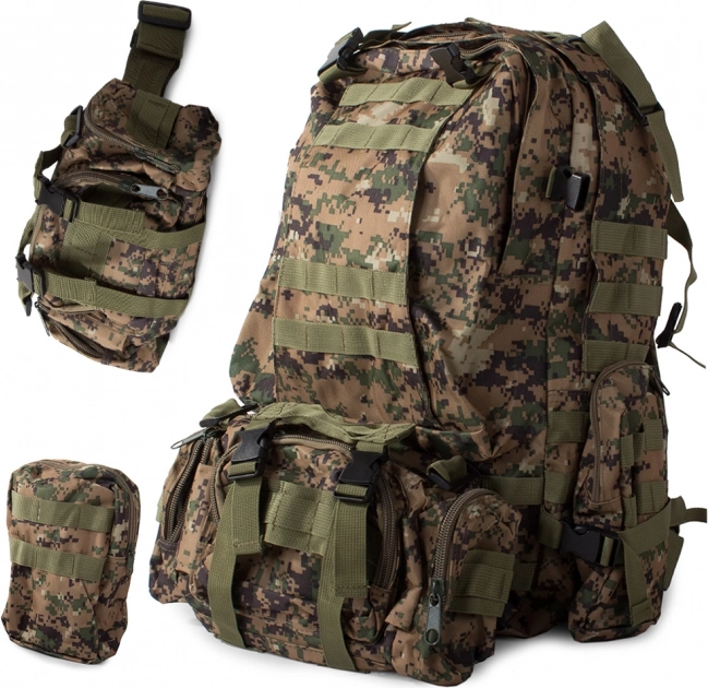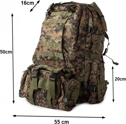 Dieser Rucksack bietet ein großes Hauptfach mit zusätzlichen Fächern, einschließlich abnehmbarer Seitentaschen und einer abnehmbaren Hüfttasche, die separat getragen werden kann. Das MOLLE-System erlaubt das Hinzufügen zusätzlicher Taschen und Module.