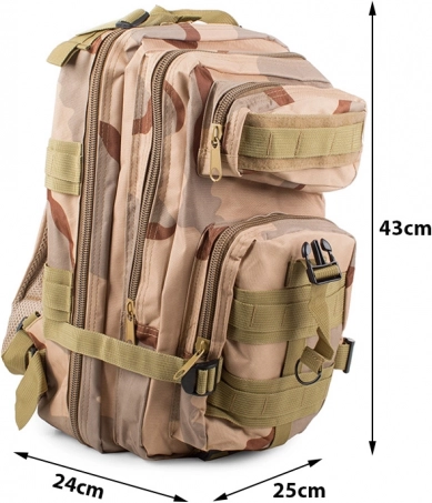 Das Innenleben ist maximal übersichtlich: Hauptfach mit weitem Öffnen und Zwei-Wege-Reißverschluss, zwei Innenfächer (Netzfach und Reißverschlussfach), kleineres zweites Abteil mit 3 Taschen (2 davon aus Netz), vorn 2 Schnellzugriffstaschen mit Mini-Organizer (5 Fächer) und ein verdecktes Rückenfach mit Platz für Hydro Pack. Dank des Systems MOLLE erweitern Sie die Kapazität leicht um zusätzliche Taschen und Module.