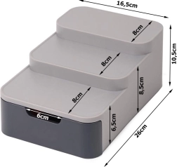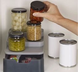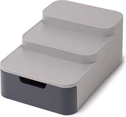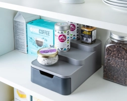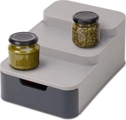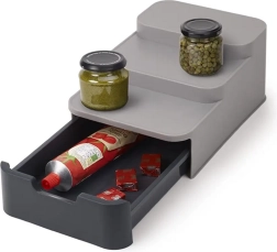 Dieser kompakte Organizer nutzt den Platz in Ihrer Speisekammer oder Ihrem Schrank effizient aus. Drei Stufen sorgen für bessere Sichtbarkeit auf Gläser und Dosen in der hinteren Reihe, während die ausziehbare Schublade Beutel, Tuben und weitere Kleinigkeiten aufnimmt. Der robuste Kunststoff in Grau lässt sich leicht reinigen und passt hervorragend in moderne Küchen.