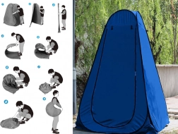Praktisches und universelles Sichtschutz-Zelt für unterwegs – dient als Umkleidekabine, Dusche und WC. Es ist selbstaufbauend, wasserabweisend und nimmt zusammengelegt nur minimalen Platz ein. Innen finden Sie eine geräumige Tasche, einen Aufhängegurt für Kleidung und ein Belüftungsfenster für bessere Luftzirkulation.