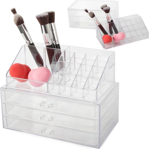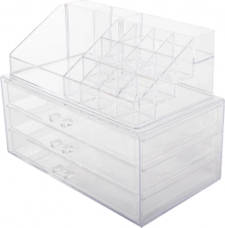 Dieser praktische zweiteilige Organizer hilft Ihnen, Ordnung unter Kosmetika und Schmuck zu halten. Der obere Teil enthält 16 verschiedene Fächer, ideal für Lippenstifte, Nagellacke, Glosse und andere Kleinigkeiten. Der untere Teil verfügt über 3 Schmuckschubladen, die Sie wegen ihrer Geräumigkeit lieben werden.