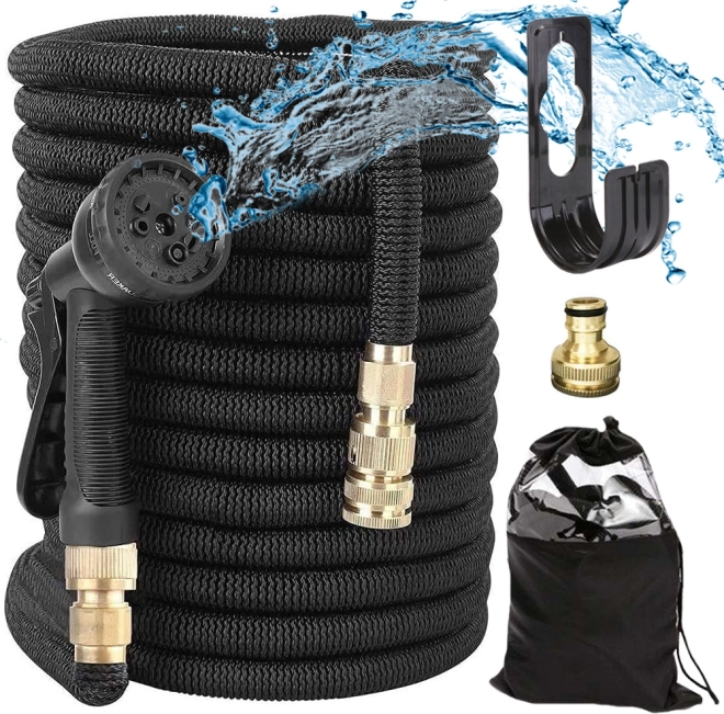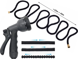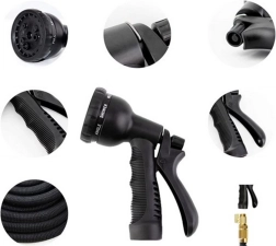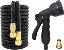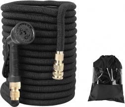 Garden hose with a length of up to 45 meters is an ideal choice for any garden. It is lightweight and expands up to three times its original length when filled with water. Thanks to its material and construction, it is resistant to tangling and offers long-lasting durability. The set includes a multifunctional spray gun with eight watering modes, ensuring convenience in its use.