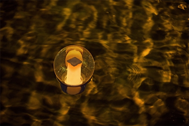 Keeps the water hygienically clean and creates pleasant ambient light in the evening without cables — the solar panel powers the LEDs for 6–8 hours.