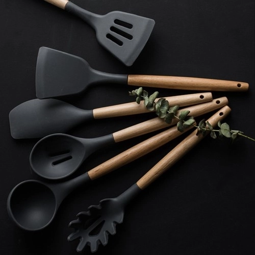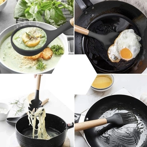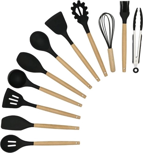 The Ruhhy brand kitchen tool set includes 12 diverse tools, including a spatula, ladle, and brush, all with ergonomic wooden handles and durable silicone heads. These tools are resistant to high temperatures, easy to clean, and prevent scratching your kitchenware.