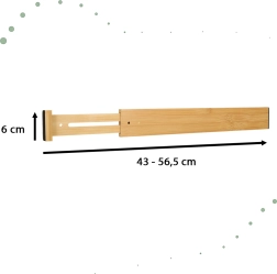 Introducing a useful helper for everyday space organization in your home. This bamboo organizer allows easy division of items in a single drawer, thanks to its adjustable length from 43 to 56.5 centimeters. It is versatile and can be used in the kitchen, bathroom, or wardrobe, even in larger drawers.