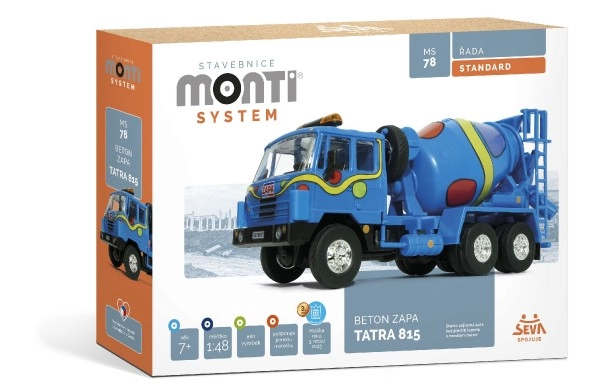 Build the iconic Czech concrete mixer MONTI SYSTEM Tatra 815 in 1:48 scale – no glue and no painting required. The kit supports fine motor skills, offers authentic detailing, and thanks to its snap-fit system delivers easy, clean assembly for children aged 7 and up.