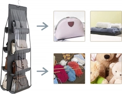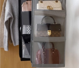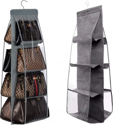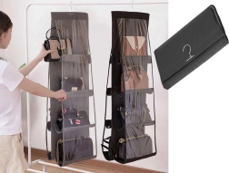 Solves space shortage and clutter issues in the wardrobe. This practical organizer fits easily into your wardrobe or closet. Its 8 transparent pockets allow you to store up to 16 handbags and provide great visibility of stored items.