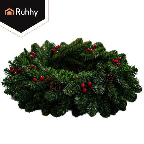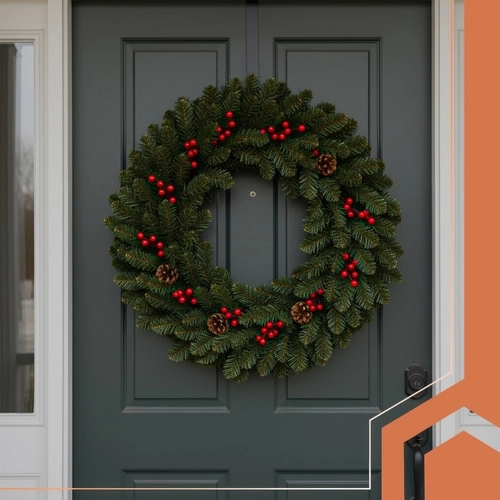 An elegant combination of green needles, red berries, and natural-looking pinecones creates a striking festive decoration for doors, walls, and mantels.