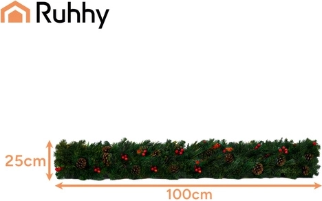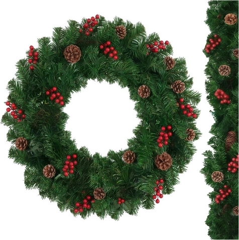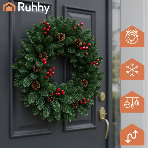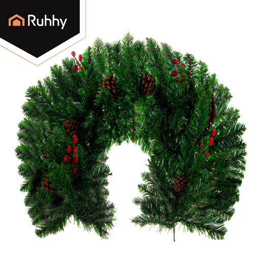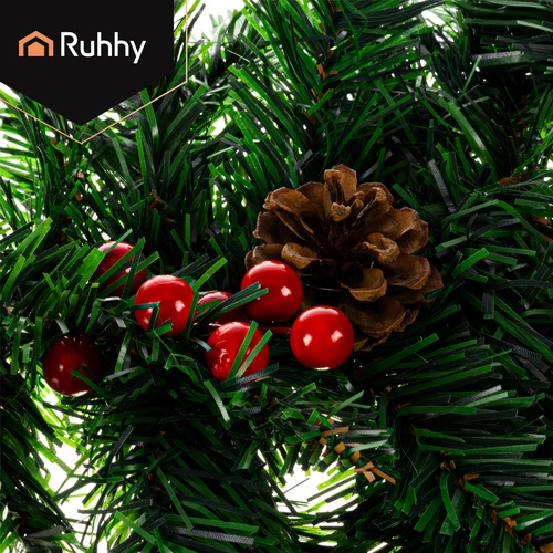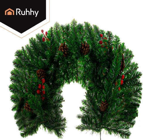 Stylish 1 m Christmas garland with dense PVC needles is ideal for decorating doors, balconies, railings, and columns. Thanks to its flexibility, you can easily shape it as needed—from straight edging to multi-layer circular decorations. Integrated pinecones and sprigs with red berries add a natural, elegant touch.