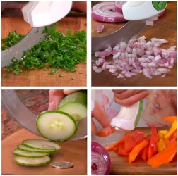 Cut pizza, meat, vegetables, herbs, fruits, and more with high precision in one stroke.