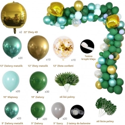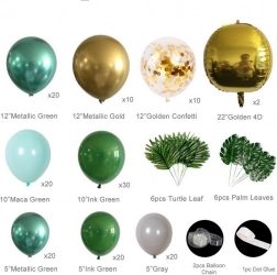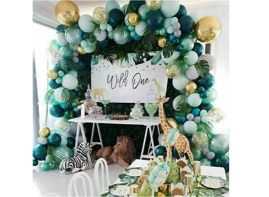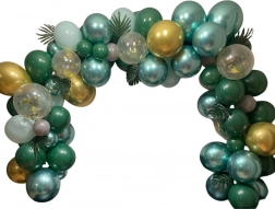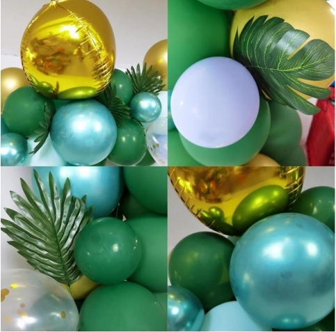 Assembly is simple: inflate the balloons with air or helium and secure them to the looped garland tape. Distribute smaller balloons around the perimeter for a full, layered effect. Tropical and palm leaves add an exotic touch and pair perfectly with the green–gold palette.