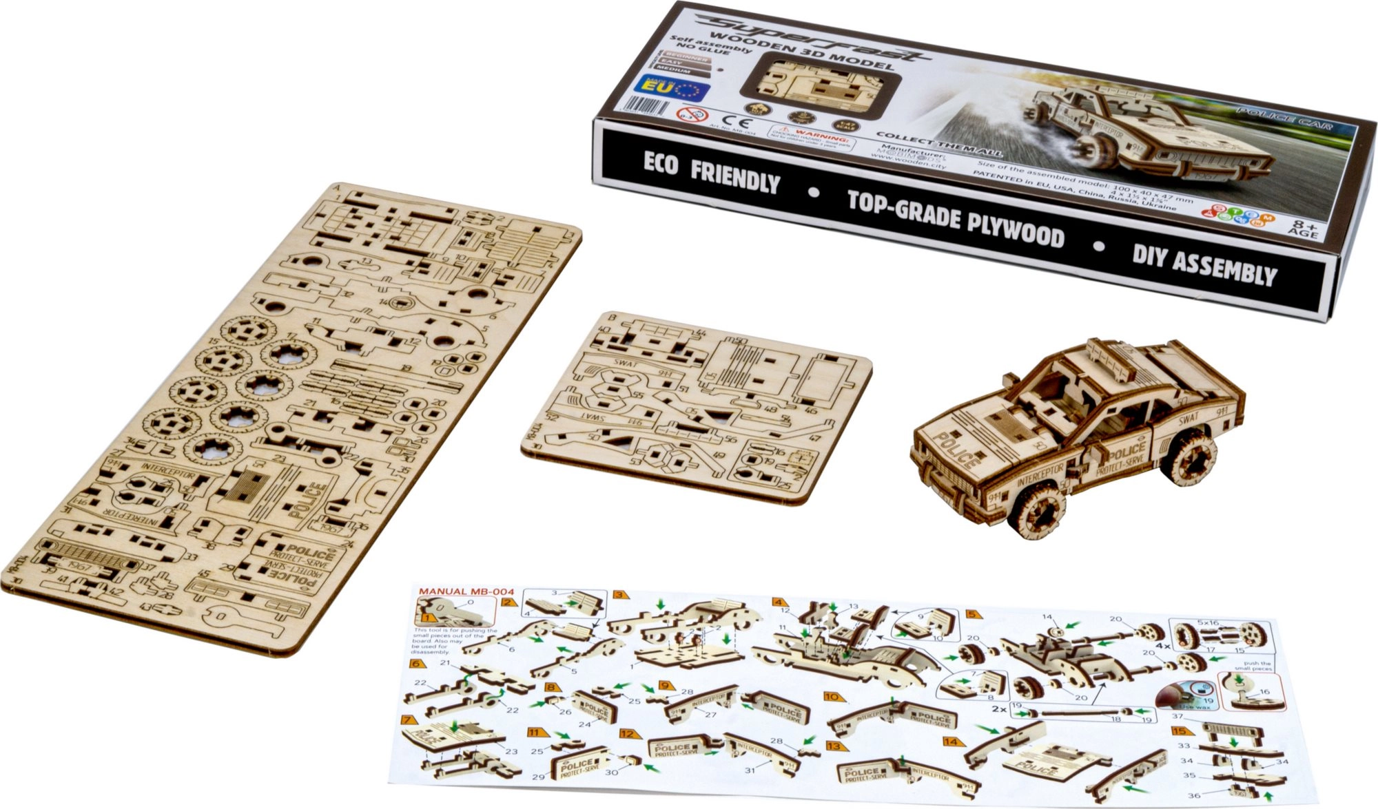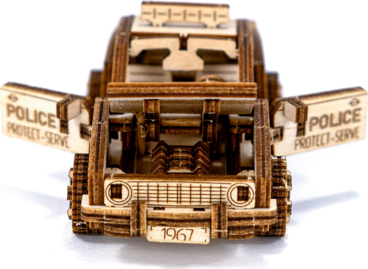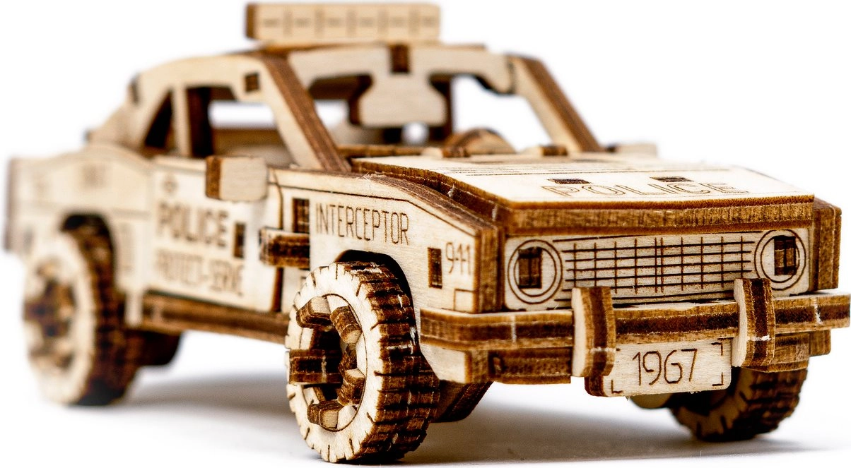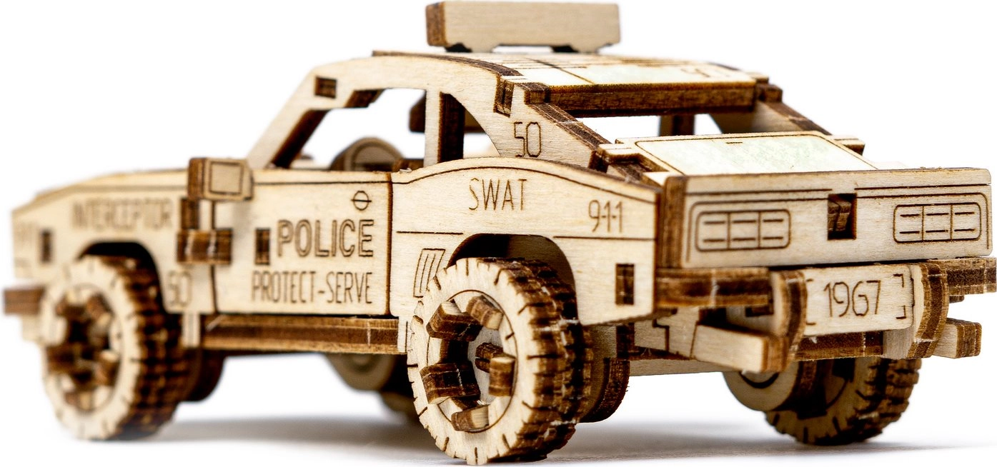 Assembly is glue-free and the pieces fit together precisely. The result is a durable miniature police car that looks great on a shelf or desk. The WOODEN CITY brand also cares about ecology—the product is packaged without plastics.