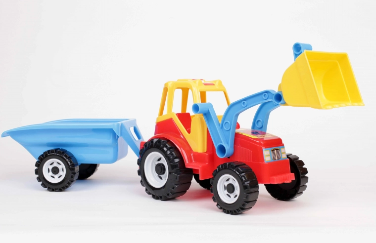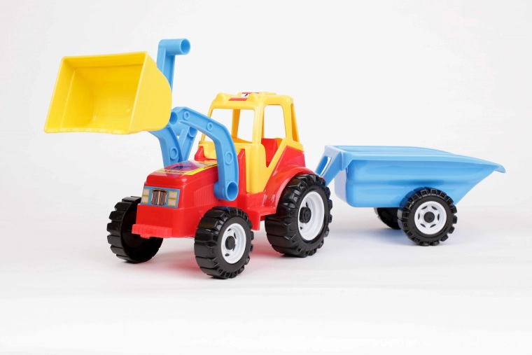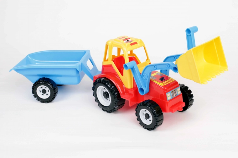 Discover a versatile toy for little builders: a tractor with a front loader and a two-wheel trailer that easily tips after release, allowing convenient unloading of sand or small items. With bold colors and realistic details, play becomes even more fun.
