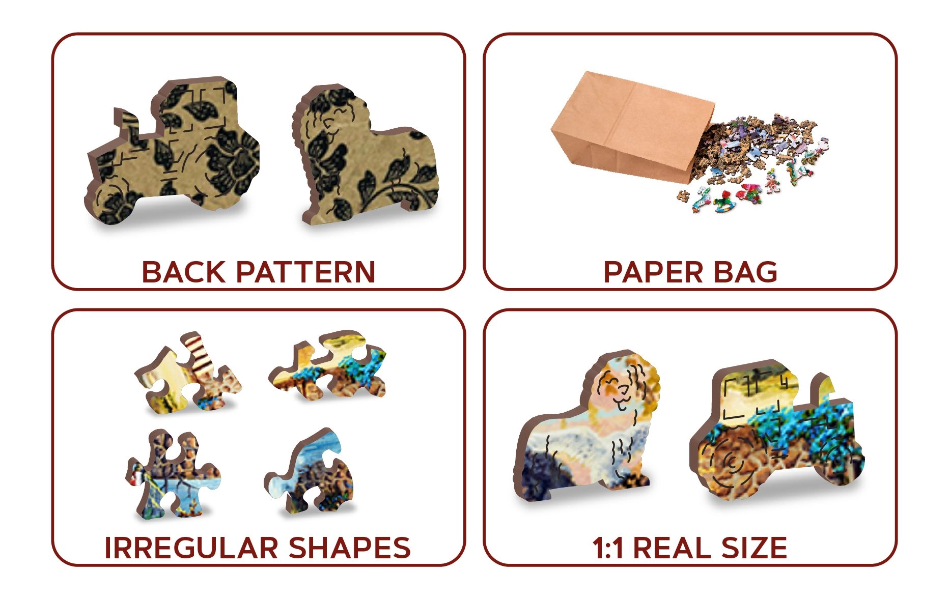 Assembling a puzzle with irregularly shaped pieces is more difficult and presents a greater challenge than putting together a classic puzzle. This puzzle is also double-sided: you can assemble it by the picture (front side) or by shape using the patterned back. In addition to a unique puzzle concept, the WOODEN CITY brand keeps ecology in mind, so you won’t find any plastic packaging with these products. Features uniquely shaped pieces depicting famous buildings, objects, or animals according to the theme. Higher difficulty with fewer pieces – assembling puzzles with irregular pieces is more demanding.