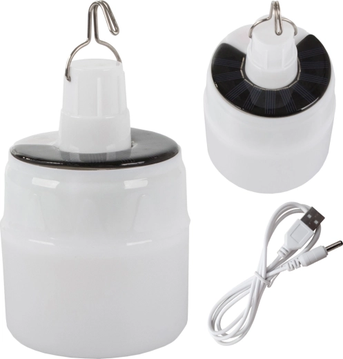 A practical solar camping lamp with a hanging hook offers powerful, energy-efficient LED lighting, 3 brightness modes, and two charging options — via the solar panel or the USB cable (included). Its lightweight, durable build is ideal for tents, patios, and gardens.