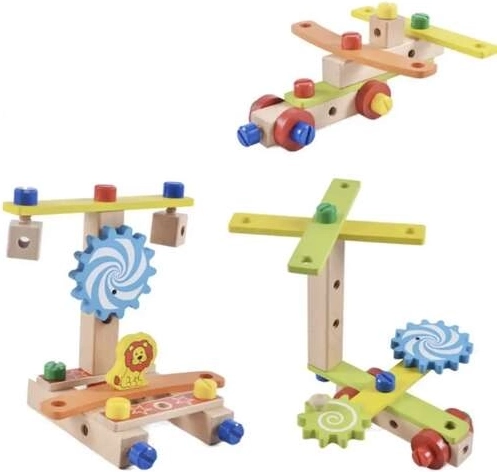Colorful gears and other interactive elements help develop motor skills and creative thinking.