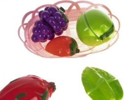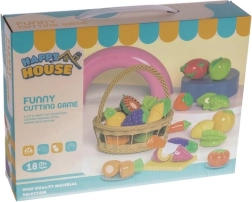 A play set for little chefs includes a basket, cutting board, knife, and colorful plastic fruits and vegetables joined with hook-and-loop fasteners. Kids can slice and reassemble, developing fine motor skills, creativity, and learning colors and food names. Ideal for pretend home, shop, and cooking play.
