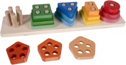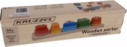 The wooden sorter and stacking toy KRUZZEL is a smart educational toy for children aged 2 and up. Colorful pieces in basic shapes — circle, triangle, square, rectangle, and pentagon — are placed on pegs with obstacles, motivating kids to handle and move their fingers precisely. The game supports recognition of colors and shapes, patience, and memory.