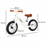 Safety and comfort are ensured by the light steel frame, non-slip grips, inflatable tires, and an adjustable seat, allowing easy adjustments for a growing child. The white and brown design adds dynamism and appeal.