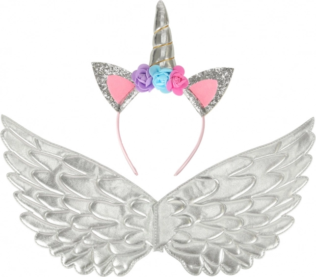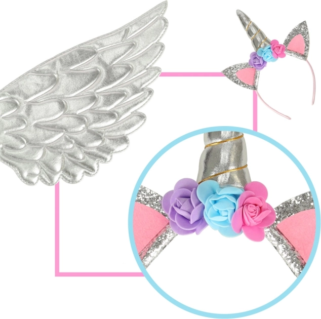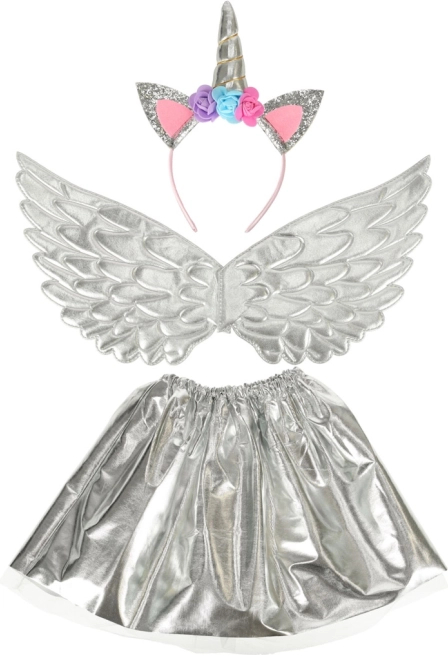 This wonderful costume allows you to turn your child into a unique unicorn. It consists of a silver skirt, elegant wings, and a finely crafted headband with roses. Ideal for any occasion where a child can enjoy fairy-tale play.