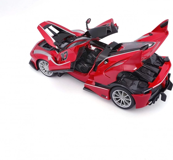 Enjoy a top-tier collectible model of the Ferrari FXX K in iconic red. The RACE+PLAY series by Bburago excels with faithful shapes, proportions, and emblems. Opening doors, hood, and trunk reveal the detailed interior and engine bay, while functional steering angle and suspension on all wheels enhance realism.