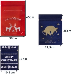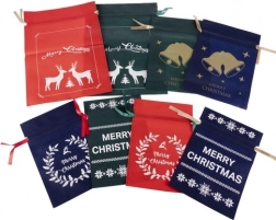Discover a simple and stylish way to wrap gifts. These Christmas gift bags made of non-woven fabric are durable, lightweight, and reusable, fitting perfectly into a zero-waste approach. The front side is decorated with reindeer, bells, holly, and star motifs in white or gold.