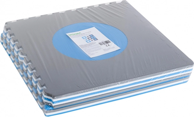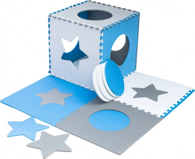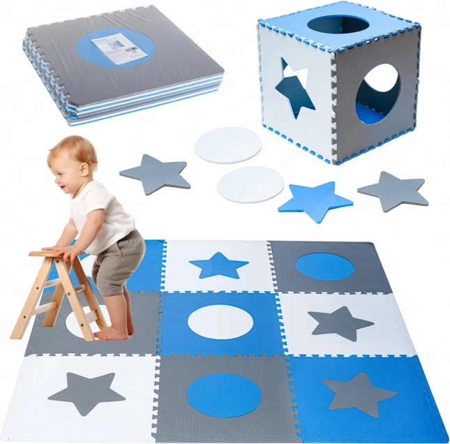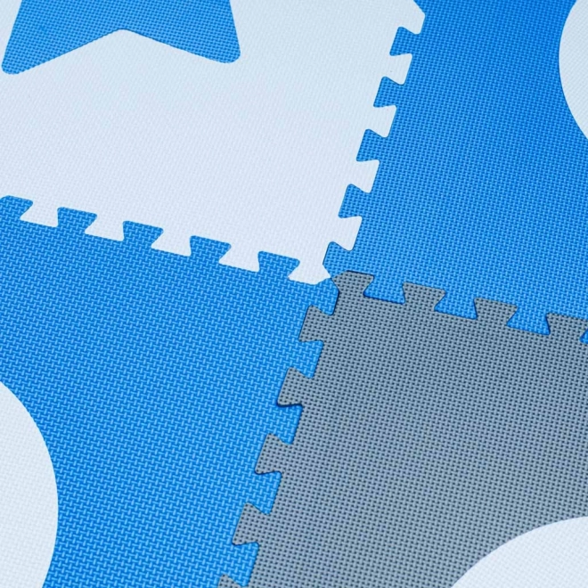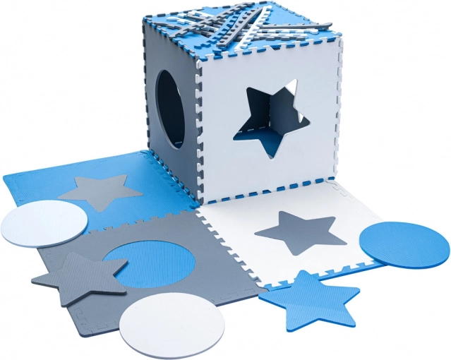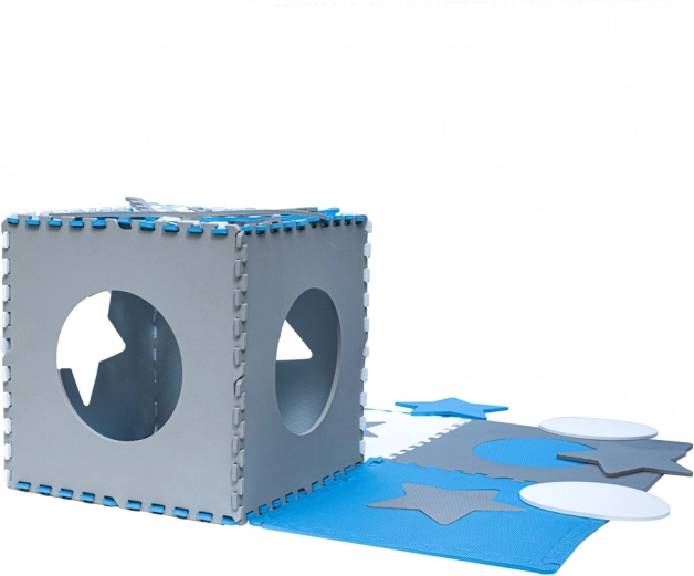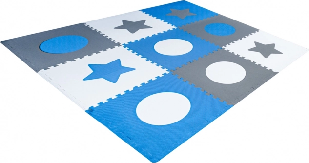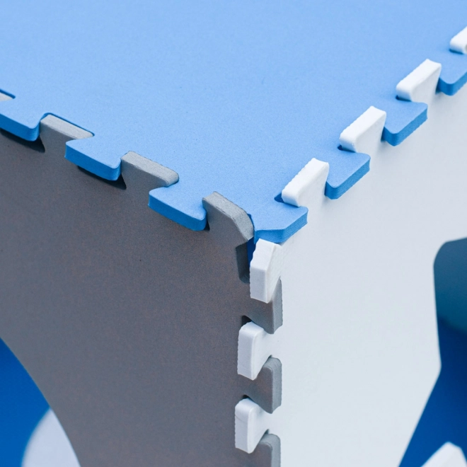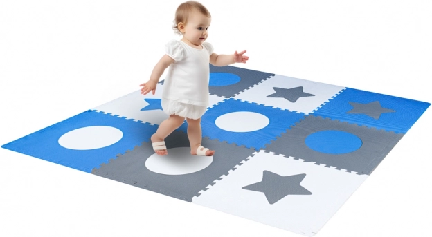 This gray–blue–white educational foam mat of 9 large-format tiles turns any room into a safe, comfortable play space. The interlocking pieces assemble like a puzzle to create a large area for crawling, first steps, and quiet play.